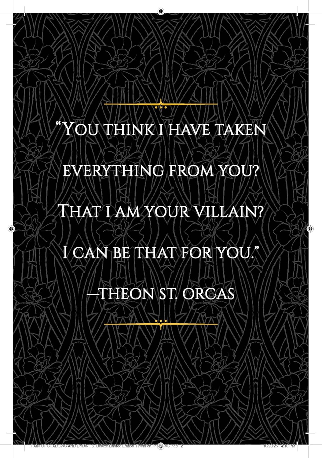 This Deluxe Limited Edition of Rain of Shadows and Endings features custom-illustrated stencilled edges, a gold-detailed hardcover, a hidden cover under the dust jacket, and fully illustrated endpapers. Designed as a premium collector’s edition for fans of dark romantasy and beautifully crafted special-edition hardbacks.